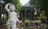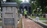 REPUBLIKA.CO.ID, JAKARTA -- Petugas membersihkan dedaunan didekat situs sejarah Mausoleum OG Khouw yang telah ditetapkan sebagai cagar budaya tahun 2024 di Jakarta, Rabu (16/10/2024).