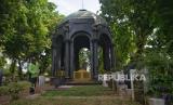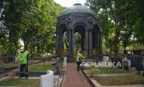 Petugas membersihkan situs sejarah Mausoleum OG Khouw yang telah ditetapkan sebagai cagar budaya tahun 2024 di Jakarta, Rabu (16/10/2024). Pemprov DKI Jakarta menetapkan 18 cagar budaya baru selama periode 2022-2024 terdiri dari 12 bangunan dan enam struktur. Dengan penambahan tersebut, tercatat total jumlah keseluruhan cagar budaya di Jakarta saat ini sebanyak 305 cagar budaya, baik yang berupa benda cagar budaya, bangunan cagar budaya, struktur cagar budaya, situs cagar budaya, maupun kawasan cagar budaya. (FOTO : Republika/Prayogi)