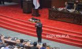 Kepala BIN terpilih Muhammad Herindra memberikan salam kepada anggota DPR saat mengikuti rapat Paripurna DPR ke-4 masa persidangan I tahun sidang 2024-2025 di Gedung Nusantara II, kompleks Parlemen, Senayan, Jakarta, Kamis (17/10/2024). Rapat paripurna menyetujui Muhammad Herindra sebagai Kepala Badan Intelijen Negara (BIN) sebagaimana diusulkan Presiden Joko Widodo kepada DPR RI. Muhammad Herindra menggantikan Budi Gunawan sebagai Kepala Badan Intelijen Negara (BIN). (FOTO : Republika/Prayogi)