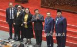 Kepala BIN terpilih Muhammad Herindra bersama ketua DPR Puan Maharani serta pimpinan DPR berfoto saat rapat Paripurna DPR ke-4 masa persidangan I tahun sidang 2024-2025 di Gedung Nusantara II, kompleks Parlemen, Senayan, Jakarta, Kamis (17/10/2024). Rapat paripurna menyetujui Muhammad Herindra sebagai Kepala Badan Intelijen Negara (BIN) sebagaimana diusulkan Presiden Joko Widodo kepada DPR RI. Muhammad Herindra menggantikan Budi Gunawan sebagai Kepala Badan Intelijen Negara (BIN). (FOTO : Republika/Prayogi)