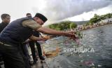 Calon Wakil Gubenur Maluku Utara Sarbin Sehe menabur bunga ke laut setelah doa bersama di Jembatan Residen Ternate,Maluku Utara,Kamis (17/10/2024). Doa bersama dan tabur bunga di laut tersebut dihadiri ratusan pendukung pasangan calon Gubernur dan Wakil Gubernur Maluku Utara nomor urut empat sebagai bentuk solidaritas dan rasa belasungkawa kepada almarhum Benny Laos atas insiden terbakarnya speedboat Bella 72 yang terjadi di Pelabuhan Regional Bobong, Kecamatan Taliabu Barat, Kabupaten Pulau Taliabu, Maluku Utara pada Sabtu (12/10). (FOTO : ANTARA FOTO/Andri Saputra)