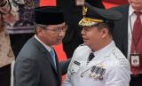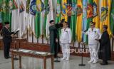 REPUBLIKA.CO.ID, JAKARTA Mendagri Tito Karnavian mengambil sumpah jabatan Penjabat (Pj) Gubernur DKI Jakarta Teguh Setyabudi dan Pj Gubernur Papua Tengah Anwar Harun Damanik saat upacara pelantikan di Kantor Kemendagri, Jakarta, Jumat (18/10/2024).