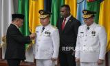 Mendagri Tito Karnavian (kiri) mengambil sumpah jabatan Penjabat (Pj) Gubernur DKI Jakarta Teguh Setyabudi (ketiga kiri) dan Pj Gubernur Papua Tengah Anwar Harun Damanik (kedua kanan) saat upacara pelantikan di Kantor Kemendagri, Jakarta, Jumat (18/10/2024). Mendagri melantik Teguh Setyabudi sebagai Pj Gubernur DKI Jakarta menggantikan Heru Budi Hartono, dan Anwar Harun sebagai Pj Gubernur Papua Tengah menggantikan Ribka Haluk. (FOTO : ANTARA FOTO/Fauzan)