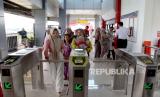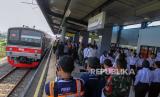 REPUBLIKA.CO.ID, DEPOK -- Sejumlah penumpang memasuki Stasiun Pondok Rajeg yang telah beroperasi kembali di Depok, Jawa Barat, Sabtu (19/10/2024).