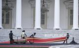 REPUBLIKA.CO.ID, JAKARTA -- Pekerja menyiapkan karpet merah untuk acara pisah sambut presiden di halaman Istana Merdeka, Jakarta, Sabtu (19/10/2024).