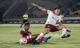 Pesepak bola Borneo FC Samarinda Mariano Ezequiel Peralta Bauer (atas) berebut bola dengan pesepak bola Persis Solo Moch Zaenuri (bawah) dalam pertandingan BRI Liga 1 di Stadion Manahan, Solo, Jawa Tengah, Sabtu (19/10/2024). Persis Solo menang atas Borneo FC Samarinda dengan skor 3-2. (FOTO : ANTARA FOTO/Mohammad Ayudha)