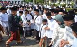 Pj Gubernur Jawa Barat (Jabar) Bey Machmudin menyapa para santri usai upacara Hari Santri Nasional 2024 Tingkat Provinsi Jabar bertajuk Menyambung Juang Merengkuh Masa Depan, di halaman Gedung Sate, Kota Bandung, Selasa (22/10/2024). Dalam sambutannya Bey mengatakan para santri memiliki peluang yang terbuka menjadi orang besar di Indonesia, dan untuk kesejahteraan, Pemprov Jabar selalu berupaya memerhatikan, seperti bantuan keuangan untuk pondok pesantren dan madrasah. (FOTO : Edi Yusuf)