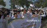 Sejumlah santri menyanyikan Mars Santri saat mengikuti upacara memperingati Hari Santri Nasional di Lapangan Maulana Yudha Negara, Tigaraksa, Kabupaten Tangerang, Banten, Selasa (22/10/2024). Upacara yang diikuti perwakilan pondok pesantren se-Kabupaten Tangerang tersebut mengusung tema Menyambung Juang, Merengkuh Masa Depan. (FOTO : ANTARA FOTO/Sulthony Hasanuddin)