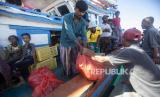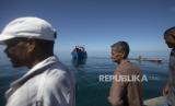 Seorang pria Rohingya menerima makanan yang diantarkan oleh nelayan setempat ke perahu mereka yang berlabuh di perairan dekat pantai Labuhan Haji, provinsi Aceh, Selasa (22/10/2024). Kapal motor pengangkut imigran Rohingya tidak bisa mendarat karena adanya penolakan dari masyarakat setempat atas kedatangan para pengungsi tersebut. Kapal tersebut mengangkut 151 orang dengan rincian 79 wanita dewasa, 13 laki-laki dewasa dan 59 anak-anak di bawah usia 10 tahun. (FOTO : AP Photo/Binsar Bakkara)