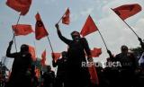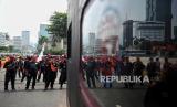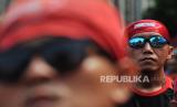 Sejumlah buruh mengikuti unjuk rasa di kawasan Patung Kuda, Jakarta, Kamis (24/10/2024). Mereka meminta pemerintah untuk menaikkan upah minimum tahun 2025 sebesar 8 hingga 10 persen serta menuntut pencabutan Omnibus Law atau UU Cipta Kerja khususnya klaster ketenagakerjaan dan perlindungan petani. Massa aksi mengancam pemerintah akan melakukan aksi mogok massal jika tuntutannya tidak dapat dipenuhi. (FOTO : Republika/Thoudy Badai)