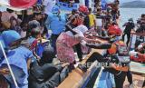 Personel gabungan memindahkan imigran etnis Rohingya di perairan laut, di Labuhan Haji, Aceh Selatan, Aceh, Kamis (24/10/2024). Sebanyak 139 imgran etnis Rohingya yang sebelumnya terombang-ambing diperairan telah dievakuasi dan akan ditempatkan di tempat penampungan sementara Terminal tipe C desa setempat. (FOTO : ANTARA FOTO/Syifa Yulinnas)
