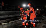 Petugas gabungan dari BPBD DKI Jakarta, Badan SAR Nasional mengevakuasi korban kecelakaan kereta lintas raya terpadu (LRT) Jabodebek pada simulasi tanggap darurat di Stasiun LRT Jabodebek, Pancoran, Jakarta Selatan, Sabtu (26/10/2024) dini hari. Simulasi tersebut bertujuan untuk meningkatkan kesiapsiagaan dalam menghadapi keadaan darurat dan memberikan rasa aman kepada pengguna LRT Jabodebek. (FOTO : Republika/Thoudy Badai)
