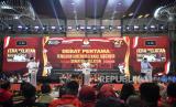 REPUBLIKA.CO.ID, PALEMBANG -- Calon Gubernur Sumatera Selatan nomor urut 1 Herman Deru bersama calon Gubernur Sumatera Selatan nomor urut 2 Eddy Santana Putra dan calon Gubernur Sumatera Selatan nomor urut 3 Mawardi Yahya mengikuti debat pertama Pemilihan Gubernur dan Wakil Gubernur Sumatera Selatan tahun 2024 di Palembang, Senin (28/10/2024).