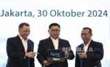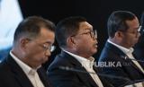 REPUBLIKA.CO.ID, JAKARTA -- Direktur Utama Bank Mandiri Darmawan Junaidi berbincang dengan Direktur Teknologi Informasi Bank Mandiri Timothy Utama dan Direktur Keuangan dan Strategi Sigit Prastowo dalam acara paparan kinerja Bank Mandiri Triwulan III/2024 di Plaza Mandiri, Jakarta, Rabu (30/10/2024).