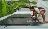 Pekerja memasang panel surya di area perkebunan hidroponik Samata Green House (SGH), Kabupaten Gowa, Sulawesi Selatan, Jumat (1/11/2024). Petani milenial di perkebunan tersebut mampu memproduksi selada hingga rata-rata 600 kilogram per bulan dengan memanfaatkan pembangkit listrik tenaga surya sebagai sumber energi untuk mengoperasikan kipas sirkulasi dan mesin embun. (FOTO : ANTARA FOTO/Hasrul Said)