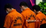 Sejumlah tersangka dihadirkan saat konferensi pers pengungkapan kasus judi online di Bareskrim Mabes Polri, Jakarta, Sabtu (2/11/2024). Bareskrim Polri membongkar situs judi online slot yang dikendalikan oleh WNA asal China dengan mengamankan tiga orang tersangka serta barang bukti uang senilai Rp70 miliar dan dua unit mobil. (FOTO : ANTARA FOTO/Rivan Awal Lingga)