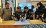 Direktur Utama Bank Syariah Artha Madani, Cahyo Kartiko (kedua kiri) bersama Direktur Wakaf Warrior Herru Setiawan (kedua kanan) menandatangani perjanjian kerjasama saat gelaran Indonesia Sharia Economic Festival (ISEF) 2024 di Jakarta Convention Center (JCC), Jakarta, Ahad (2/11/2024). Bank Syariah Artha Madani menjalin kerja sama dengan Wakaf Warrior terkait Cash Waqf Linked Deposit (CWLD) dalam pengadaan fasilitas gerobak madani kepada para pelaku UMKM guna membantu pertumbuhan usaha. (FOTO : Republika/Thoudy Badai)