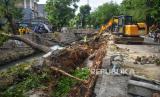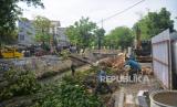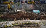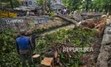 Turap kali yang sedang dalam proses renovasi itu longsor sepanjang 45 meter, termasuk trotoar, sejumlah pohon tumbang dan tiang listrik roboh.