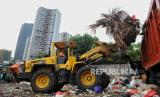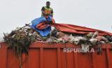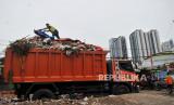 Petugas mengangkut sampah ke atas mobil truk untuk dibawa menuju Tempat Pengolahan Sampah Terpadu (TPST) Bantargebang, Bekasi di Bank Sampah Depo Menteng Atas, Setiabudi, Jakarta, Senin (4/11/2024). Pemprov DKI Jakarta menargetkan akan melakukan pengurangan sampah sebesar 30 persen dan penanganan mencapai 70 persen pada tahun 2025. Sementara berdasarkan data Bank Sampah Depo Menteng Atas, jumlah sampah harian di wilayah Kecamatan Setiabudi menncapai 100 ton per hari dan sekitar 7.000 ton per hari untuk seluruh wilayah di DKI Jakarta. (FOTO : Republika/Thoudy Badai)