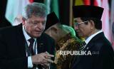 Menteri Agama Nasaruddin Umar (kanan) berbincang dengan Duta Besar Palestina untuk Indonesia Zuhair Al-Shun seusai pembukaan Konferensi Internasional Humanitarian Islam 2024 di Kampus Universitas Indonesia, Depok, Jawa Barat, Selasa (5/11/2024). Konferensi yang diselenggarakan oleh PBNU tersebut dihadiri oleh para sarjana dan akademisi berbagai negara untuk merumuskan dan menawarkan solusi dari berbagai macam konflik yang terjadi di berbagai belahan dunia. (FOTO : ANTARA FOTO/Sigid Kurniawan)
