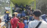 Warga mnengungsi saat Gunung Lewotobi Laki-Laki mengeluarkan abu vulkanik di Kabupaten Flores Timur, NTT, Selasa (5/11/2024). Gunung Lewotobi Laki-Laki yang berstatus awas kembali erupsi dengan ketinggian kolom abu mencapai 1.000 meter. (FOTO : AP Photo)
