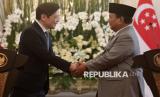 Presiden Prabowo Subianto (kanan) berjabat tangan dengan Perdana Menteri Singapura Lawrence Wong (kiri) seusai menyampaikan pernyataan pers saat pertemuan bilateral di Istana Merdeka, Jakarta, Rabu (6/11/2024). Pertemuan bilateral tersebut membahas kerjasama pertahanan dan hukum, ekonomi, teknologi energi rendah karbon, ketahanan pangan, serta pengembangan sumber daya manusia.  (FOTO : EPA-EFE/ADI WEDA)
