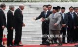Presiden Prabowo Subianto (kanan) bersama Perdana Menteri Singapura Lawrence Wong (kedua kanan) berjalan seusai memeriksa pasukan di Istana Merdeka, Jakarta, Rabu (6/11/2024). Presiden Prabowo menerima kunjungan kenegaraan Perdana Menteri Singapura Lawrence Wong di Istana Kepresidenan Jakarta. (FOTO : EPA-EFE/ADI WEDA)