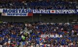 Suporter timnas Jepang saat menyaksikan pertandingan babak ketiga Kualifikasi Piala Dunia 2026 Grup C melawan Indonesia di Stadion Utama Gelora Bung Karno (SUGBK), Jakarta, Jumat (15/11/2024). Dalam pertandingan tersebut, Indonesia kalah atas Jepang dengan skor 0-4. (FOTO : Republika/Thoudy Badai)