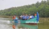 Direktur Utama Telkom Ririek Adriansyah bersama Kepala Desa Tambak Bulusan Ahmad Habibuloh dengan menggunakan perahu menuju lokasi penanaman pohon mangrove dalam kegiatan bertajuk Aksi Restorasi Bumi di Pantai Istambul Glagah Wangi, Demak, Jawa Tengah, Jumat (15/11/2024). PT Telkom Indonesia (Persero) Tbk (Telkom) terus menunjukkan komitmennya dalam mengimplementasikan praktik Keberlanjutan atau ESG di seluruh aspek dan lini bisnis perusahaan. Hal ini diwujudkan melalui kegiatan Aksi Restorasi Bumi dengan melakukan penanaman 10 ribu pohon mangrove di Pantai Istambul Glagah Wangi, Demak, Jawa Tengah. Secara nasional, tahun ini Telkom telah berkontribusi untuk mengurangi dampak lingkungan melalui penanaman lebih dari 90 ribu pohon darat, 50 ribu pohon mangrove, dan 870 terumbu karang. Dengan demikian perusahaan tidak hanya berfokus pada upaya peningkatan kesadaran masyarakat akan kesehatan, namun juga pelestarian lingkungan demi keberlangsungan hidup dan masa depan yang lebih baik. (FOTO : Republika/Prayogi)