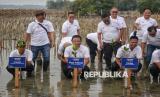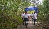 Direktur Utama Telkom Ririek Adriansyah (tengah) bersiap menanam pohon mangrove dalam kegiatan bertajuk Aksi Restorasi Bumi di Pantai Istambul Glagah Wangi, Demak, Jawa Tengah, Jumat (15/11/2024). PT Telkom Indonesia (Persero) Tbk (Telkom) terus menunjukkan komitmennya dalam mengimplementasikan praktik Keberlanjutan atau ESG di seluruh aspek dan lini bisnis perusahaan. Hal ini diwujudkan melalui kegiatan Aksi Restorasi Bumi dengan melakukan penanaman 10 ribu pohon mangrove di Pantai Istambul Glagah Wangi, Demak, Jawa Tengah. Secara nasional, tahun ini Telkom telah berkontribusi untuk mengurangi dampak lingkungan melalui penanaman lebih dari 90 ribu pohon darat, 50 ribu pohon mangrove, dan 870 terumbu karang. Dengan demikian perusahaan tidak hanya berfokus pada upaya peningkatan kesadaran masyarakat akan kesehatan, namun juga pelestarian lingkungan demi keberlangsungan hidup dan masa depan yang lebih baik. (FOTO : Republika/Prayogi)