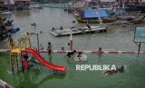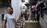 Anak bermain saat banjir rob di kawasan Muara Angke, Jakarta Utara, Selasa (19/11/2024). Banjir setinggi sekitar 30-60 centimeter tersebut terjadi akibat pasang air laut yang melanda beberapa kawasan di pesisir Jakarta Utara. Warga menuturkan banjir tersebut menggenangi pemukiman kawasan pesisir sudah memasuki hari kelima. Sementara menurut BPBD DKI Jakarta fenomena pasang maksimum air laut disebabkan oleh fase bulan baru yang berpotensi banjir rob hingga 21 November mendatang. (FOTO : Republika/Thoudy Badai)