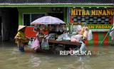 Warga menaiki kendaraan menembus banjir rob di kawasan Muara Angke, Jakarta Utara, Selasa (19/11/2024). Banjir setinggi sekitar 30-60 centimeter tersebut terjadi akibat pasang air laut yang melanda beberapa kawasan di pesisir Jakarta Utara. Warga menuturkan banjir tersebut menggenangi pemukiman kawasan pesisir sudah memasuki hari kelima. Sementara menurut BPBD DKI Jakarta fenomena pasang maksimum air laut disebabkan oleh fase bulan baru yang berpotensi banjir rob hingga 21 November mendatang. (FOTO : Republika/Thoudy Badai)