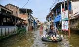 REPUBLIKA.CO.ID, BANDUNG -- Warga menggunakan perahu karet untuk menuju rumah saat banjir melanda Kampung Bojongasih, Dayeuhkolot, Kabupaten Bandung, Jawa Barat, Ahad (24/11/2024).