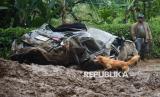 Seekor anjing berjalan di dekat sebuah mobil yang hancur akibat tanah longsor di Desa Semangat Gunung, Karo, Sumatera Utara, Minggu (24/11/2024). Tanah longsor yang terjadi pada Sabtu (23/11) tersebut mengakibatkan empat orang meninggal dunia, 11 warga luka-luka, beberapa bangunan rusak, dan enam warga lainnya masih dalam pencarian. (FOTO : ANTARA FOTO/Fransisco Carolio)