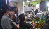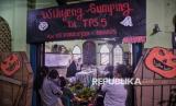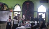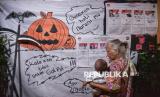 Warga mengamati dekorasi di TPS 05 Panaragan-Bakbis, Kebon Kelapa, Bogor, Rabu (27/11/2024). TPS dengan jumlah total DPT 437 tersebut sengaja mengusung tema halloween dan menampilkan suasana horor serta berhantu untuk menarik warga datang menggunakan hak pilihnya dalam Pilkada 2024. Terbukti cara ini ternyata manjur dan pemilih sangat antusias datang ke TPS 05. (FOTO : Republika/Prayogi)