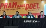 Pasangan Calon Gubernur dan Wakil Gubernur DKI Jakarta nomor urut 3 Pramono Anung (kedua kiri) dan Rano Karno (kedua kanan), Ketua Tim Pemenangan Lies Hartono atau Cak Lontong (kiri) dan Bendahara Tim Pemenangan Charles Honoris (kanan) menyampaikan konferensi pers terkait perhitungan cepat Pilkada 2024 di Jakarta, Rabu (27/11/2024). Dalam kesempatannya, paslon Pramono-Rano mengucapkan terimakasih kepada warga Jakarta atas dukungannya, dan berharap hasil quick count, exit poll dan real count dari KPU DKI Jakarta berbuah kemenangan baginya. Namun, berdasarkan quick count atau perhitungaan cepat dari Litbang Kompas pukul 16.07 dengan jumlah suara masuk sebesar 87,50 persen, pasangan Calon Gubernur dan Wakil Gubenur DKI Jakarta nomor urut tiga Pramono Anung-Rano Karno unggul 49,40 persen, paslon nomor urut satu Ridwan Kamil-Suswono 40,26 persen dan paslon nomor urut dua Dharma Pongrekun-Kun Wardana 10,34 persen (FOTO : Republika/Thoudy Badai)