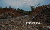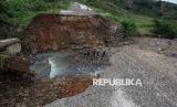Kondisi jalan yang terputus akibat longsor dan jembatan terbawa arus sungai di Desa Hambalang, Kabupaten Bogor, Jawa Barat, Kamis (28/11/2024). Jembatan di Jalan Puncak 2 penghubung Desa Hambalang Kecamatan Citeureup, dan Desa Babakan Madang Kecamatan Babakan Madang tersebut longsor dan ambruk terbawa arus sungai karena hujan deras pada Rabu (27/11/2024) sehingga akses jalan tersebut putus. (FOTO : ANTARA FOTO/Yulius Satria Wijaya)