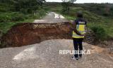 Petugas PUPR melihat kondisi jalan yang terputus akibat longsor dan jembatan terbawa arus sungai di Desa Hambalang, Kabupaten Bogor, Jawa Barat, Kamis (28/11/2024). Jembatan di Jalan Puncak 2 penghubung Desa Hambalang Kecamatan Citeureup, dan Desa Babakan Madang Kecamatan Babakan Madang tersebut longsor dan ambruk terbawa arus sungai karena hujan deras pada Rabu (27/11/2024) sehingga akses jalan tersebut putus. (FOTO : ANTARA FOTO/Yulius Satria Wijaya)
