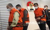 REPUBLIKA.CO.ID, JAKARTA -- Petugas KPK menjaga tiga tersangka baru kasus dugaan suap pengadaan dan pemeliharaan jalur kereta di DJKA Kemenhub dalam konferensi pers di Gedung Merah Putih KPK, Jakarta, Kamis (28/11/2024).