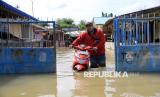 Warga mendorong motornya saat melintasi banjir yang belum surut di Kecamatan Medan Labuhan, Medan, Sumatera Utara, Sabtu (30/11/2024). Badan Penanggulangan Bencana Daerah (BPBD) Kota Medan mencatat sebanyak 7.699 rumah atau 8.751 kepala keluarga terdampak banjir akibat luapan sungai pada Rabu (27/11) yang disebabkan curah hujan tinggi. (FOTO : ANTARA FOTO/ Yudi Manar)