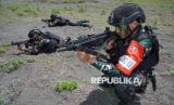 Prajurit Komando Pasukan Gerak Cepat (Kopasgat) TNI AU menyerbu area musuh saat pelaksanaan Fire Power Demo dalam Latihan Angkasa Yudha 2024 di Lapangan Air Weapon Range (AWR) Pandanwangi, Lumajang, Jawa Timur, Selasa (3/12/2024). Latihan tempur yang menyimulasikan 16 misi operasi militer diikuti sedikitnya 2512 personel TNI AU dengan menggunakan 54 pesawat tempur dan lima pesawat penunjang tersebut bertujuan untuk mendemonstrasikan keterpaduan satuan-satuan TNI AU dalam mengoperasikan dan menerapkan doktrin operasi udara. (FOTO : ANTARA FOTO/Irfan Sumanjaya)