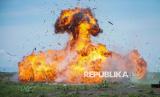 Ledakan amunisi kendaraan taktis P6-ATAV milik TNI AU mengenai sasaran saat pelaksanaan Fire Power Demo dalam Latihan Angkasa Yudha 2024 di Lapangan Air Weapon Range (AWR) Pandanwangi, Lumajang, Jawa Timur, Selasa (3/12/2024). Latihan tempur yang menyimulasikan 16 misi operasi militer diikuti sedikitnya 2512 personel TNI AU dengan menggunakan 54 pesawat tempur dan lima pesawat penunjang tersebut bertujuan untuk mendemonstrasikan keterpaduan satuan-satuan TNI AU dalam mengoperasikan dan menerapkan doktrin operasi udara. (FOTO : ANTARA FOTO/Irfan Sumanjaya)