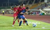 Pemain timnas putri Indonesia Katarina Matilda Putri Stalin berebut bola dengan pemain Kamboja saat pertandingan final Piala AFF Wanita 2024 di New Laos National Stadium, Vientiane, Kamis (5/12/2024). Indonesia berhasil menjadi juara Piala AFF Wanita setelah mengalahkan Kamboja dengan skor 3-1. Gol Indonesia dicetak Reva Octaviani di menit ke-19 dan 57, serta Sydney Sari Hopper di menit ke-36. Satu gol Kamboja dicetak Hok Saody di menit ke-31. (FOTO : Dok PSSI)
