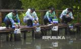 Sejumlah peserta menanam pohon mangrove dalam kegiatan bersama Badan Pengelola Keuangan Haji (BPKH) di Taman Wisata Alam Mangrove Angke Kapuk, Jakarta, Sabtu (7/12/2024). Badan Pengelola Keuangan Haji (BPKH) menanam 1.000 pohon mangrove dan melepasliarkan 60 burung jenis Dederuk Jawa, Perenjak Jawa, dan Kutilang untuk menjaga kelestarian alam di wilayah pesisir. (FOTO : ANTARA FOTO/Muhammad Ramdan)