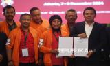 Ketua KPUD DKI Jakarta Wahyu Dinata (kanan) memberikan berita acara rapat pleno rekapitulasi hasil penghitungan perolehan suara dan penetapan hasil PIlgub 2024 kepada tim saksi pasangan nomor urut 3 Pramono Anung-Rano Karno yang diwakili Ida Mahmudah (tengah) di Jakarta, Ahad (8/12/2024). Pasangan nomor urut 3 Pramono Anung-Rano Karno (Si Doel) unggul dengan perolehan 2.183.239 suara atau 50,07 persen, disusul pasangan nomor urut 1 Ridwan Kamil-Suswono dengan dengan 1.718.160 suara atau 39,40 persen, dan pasangan nomor urut 2 Dharma Pongrekun-Kun Wardhana yang meraih 459.230 suara atau 10,53 persen. (FOTO : ANTARA FOTO/Akbar Nugroho Gumay)
