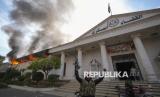 Pejuang oposisi meluapkan kegembiraanya saat membakar bangunan pengadilan militer di Damaskus, Suriah, Ahad (8/12/2024). Kekuasaan Partai Baath di Suriah tumbang pada Ahad (8/12/2024). Hal itu ditandai ibu kota Damaskus lepas dari kendali rezim Presiden Bashar al-Assad. Runtuhnya kekuatan pasukan Assad di ibu kota mengakhiri 61 tahun pemerintahan Partai Baath yang penuh kekerasan dan 53 tahun kekuasaan keluarga Assad. (FOTO : AP Photo/Hussein Malla)