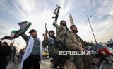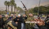 Pejuang oposisi merayakan pengambilalihan ibu kota Damaskus oleh pemberontak di Damaskus, Suriah, Ahad (8/12/2024). Kekuasaan Partai Baath di Suriah tumbang pada Ahad (8/12/2024). Hal itu ditandai ibu kota Damaskus lepas dari kendali rezim Presiden Bashar al-Assad. Runtuhnya kekuatan pasukan Assad di ibu kota mengakhiri 61 tahun pemerintahan Partai Baath yang penuh kekerasan dan 53 tahun kekuasaan keluarga Assad. (FOTO : AP Photo/Hussein Malla)