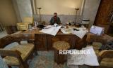 Seorang pejuang oposisi Suriah duduk di dalam kantor Istana Kepresidenan setelah pemerintahan Suriah runtuh di Damaskus, Suriah, Ahad (8/12/2024). Kekuasaan Partai Baath di Suriah tumbang pada Ahad (8/12/2024). Hal itu ditandai ibu kota Damaskus lepas dari kendali rezim Presiden Bashar al-Assad. Runtuhnya kekuatan pasukan Assad di ibu kota mengakhiri 61 tahun pemerintahan Partai Baath yang penuh kekerasan dan 53 tahun kekuasaan keluarga Assad. (FOTO : AP Photo/Hussein Malla)