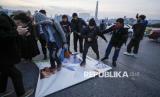 Warga Suriah menginjak foto Presiden Suriah Bashar Assad saat merayakan kedatangan pejuang oposisi di Damaskus, Suriah, Ahad (8/12/2024). Kekuasaan Partai Baath di Suriah tumbang pada Ahad (8/12/2024). Hal itu ditandai ibu kota Damaskus lepas dari kendali rezim Presiden Bashar al-Assad. Runtuhnya kekuatan pasukan Assad di ibu kota mengakhiri 61 tahun pemerintahan Partai Baath yang penuh kekerasan dan 53 tahun kekuasaan keluarga Assad. (FOTO : AP Photo/Omar Sanadiki)