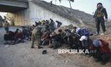 Tentara pemerintah dan sekutunya duduk di tanah saat mereka ditahan oleh pejuang oposisi di jalan antara Homs dan Damaskus, dekat Homs, Suriah, Ahad (8/12/2024). Kekuasaan Partai Baath di Suriah tumbang pada Ahad (8/12/2024). Hal itu ditandai ibu kota Damaskus lepas dari kendali rezim Presiden Bashar al-Assad. Runtuhnya kekuatan pasukan Assad di ibu kota mengakhiri 61 tahun pemerintahan Partai Baath yang penuh kekerasan dan 53 tahun kekuasaan keluarga Assad. (FOTO : AP Photo/Ghaith Alsayed)